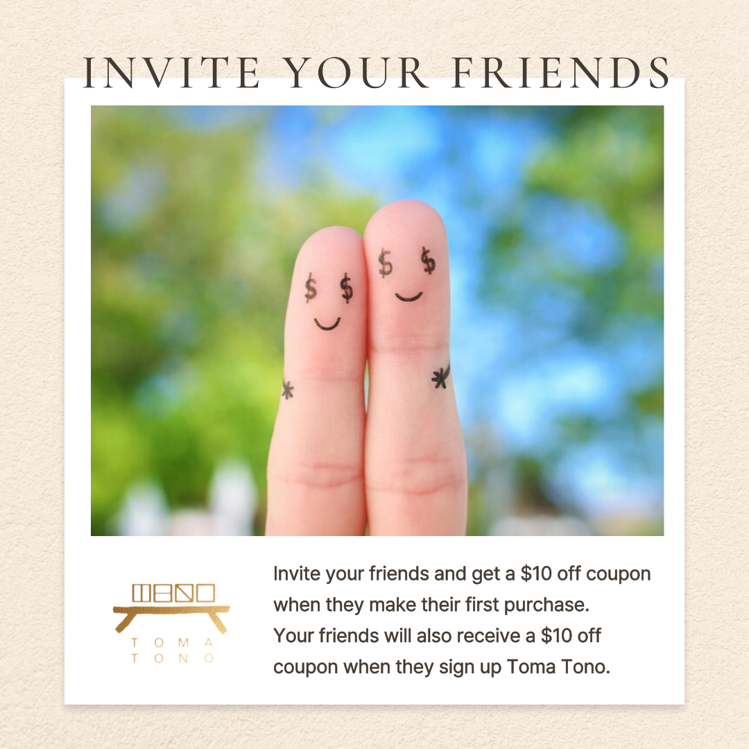 친구를 초대하고 $10 할인 쿠폰을 받으세요. 친구가 Toma Tono에 가입하면 친구는 $10 할인 쿠폰을 받게 됩니다. 친구가 첫 구매를 하면 초대자도 $10 할인 쿠폰을 받을 수 있습니다. 최소 구매 금액 제약없이 먹고 싶은 것을 무엇이든 구매하세요. 주의할 점은 할인을 적용한 후 총 금액이 95달러 이상이 되어야 무료 배송이 가능합니다. 친구를 초대하려면 아래 버튼을 눌러 계정을 만들어 주세요.
