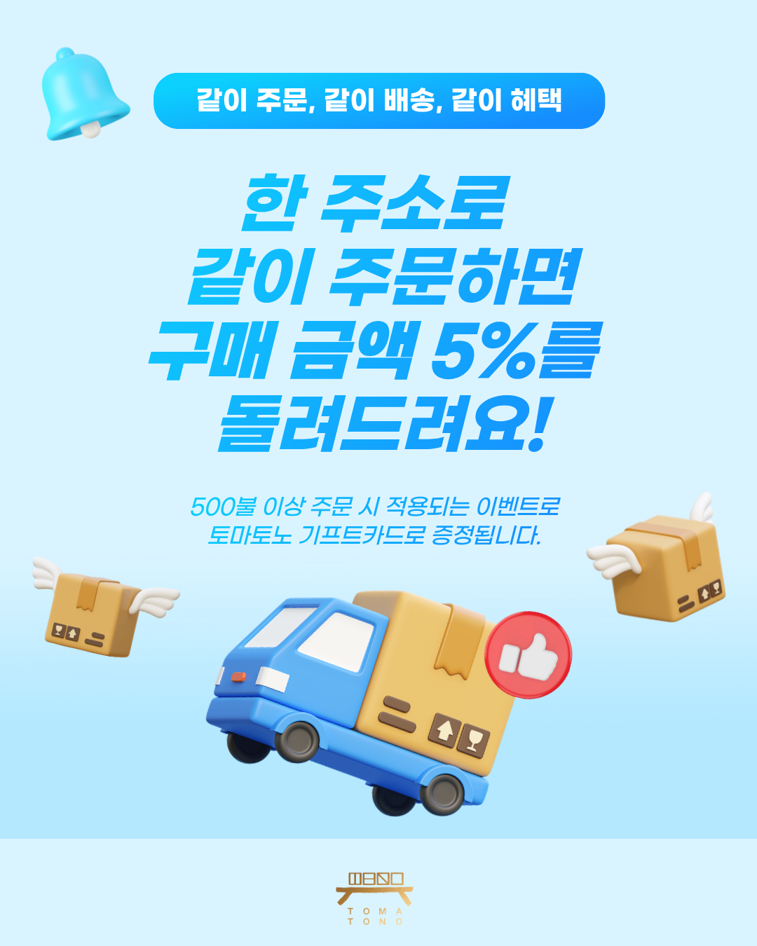 가족, 친구들과 사는 곳이 가깝다면 맛있는 토마토노 음식을 한 주소로 배송 받아보세요. 한 주소로 같이 주문하면 구매 금액 5%를 돌려드립니다!