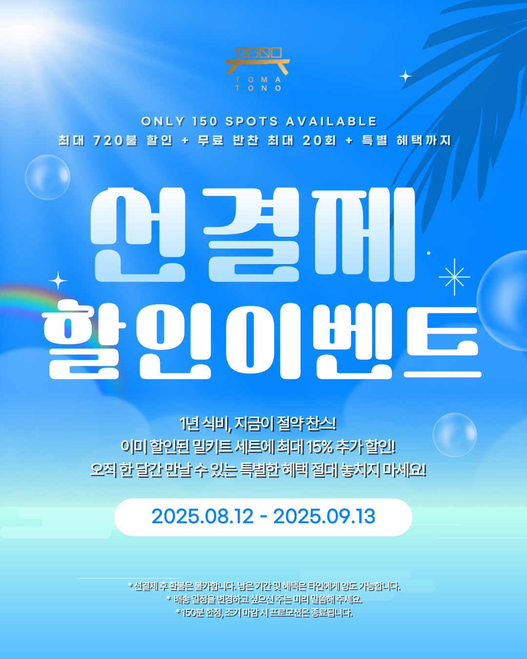 현금 할인이 돌아왔습니다! 여름이 다가오고 방학 시즌이 시작되면서, 아이들과 함께 보내는 소중한 시간, 친구와 가족과 함께 하는 여행 및 다양한 모임을 기대합니다. 이 특별한 순간들을 더욱 특별하게 만들기 위해 토마토노가 현금 결제 구매 고객님께 3% 할인을 제공합니다. 물가 상승으로 인해 경제적으로 힘든 시기인데 토마토노 밀키트로 돈과 시간 모두 절약하세요.