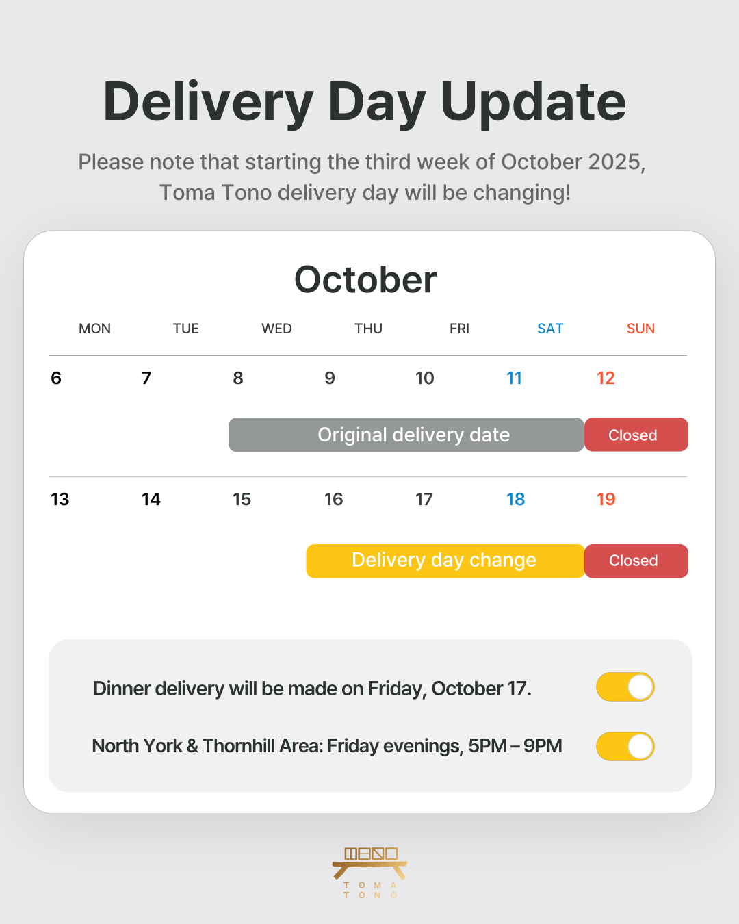 We would like to inform you that starting the third week of October 2025, our delivery days will be updated.