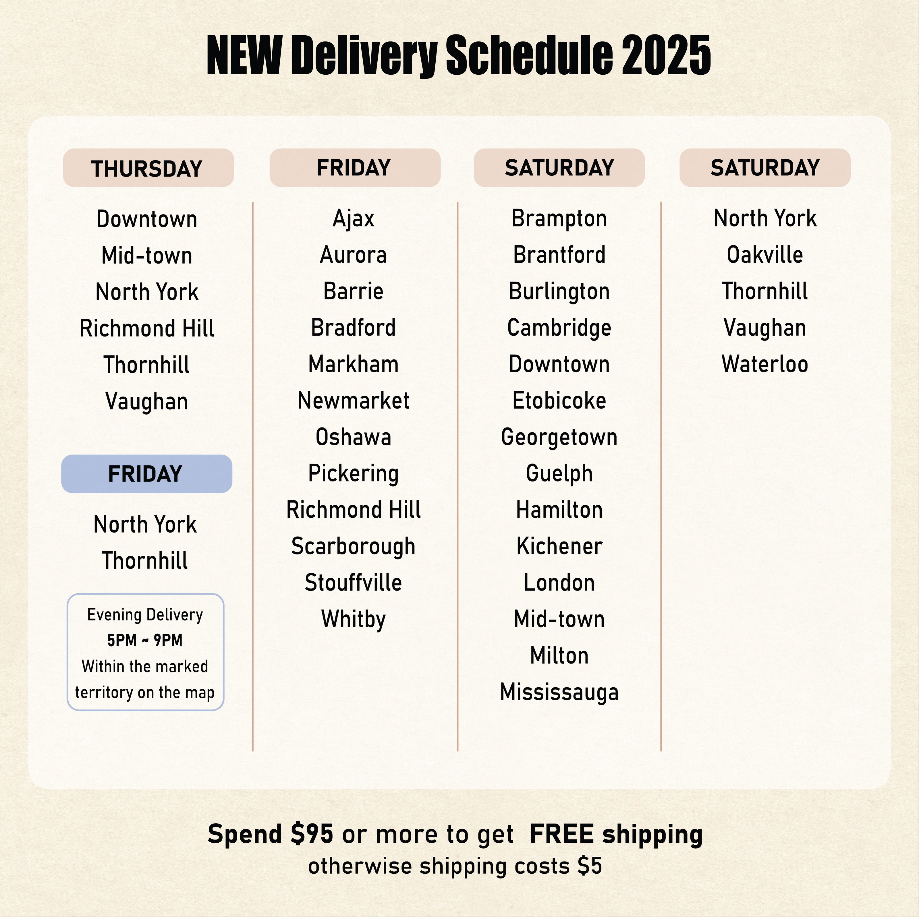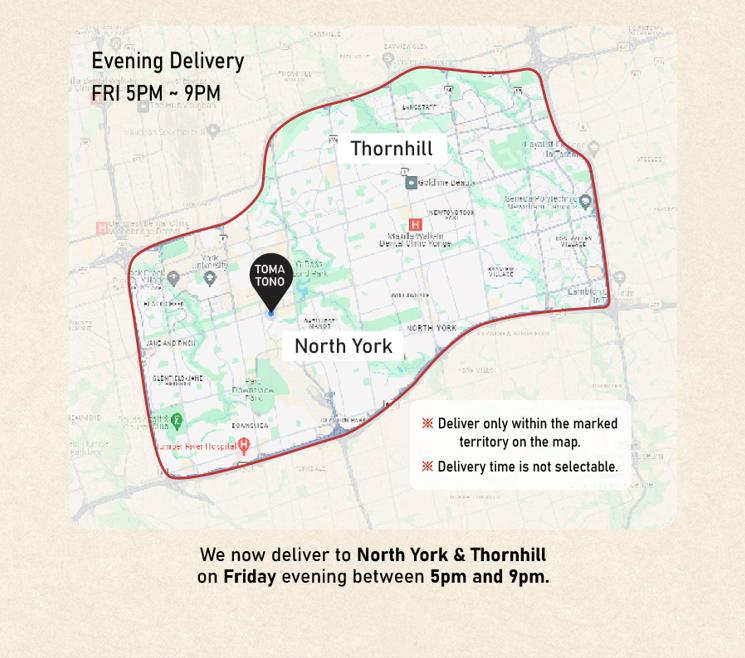 * Friday: Evening Delivery Only in Thornhill and North York between 5PM & 9PM. Delivery time can't be selected or changed. Check the Map Below for the delivery location. *