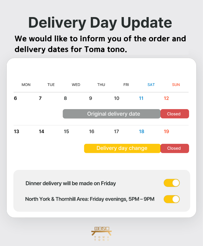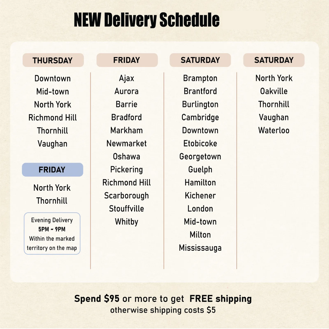 - 星期三:仅在Thornhill和North York地区提供晚上配送,时间为下午5点至晚上9点。配送时间无法选择或更改。请查看下方地图以了解配送位置。