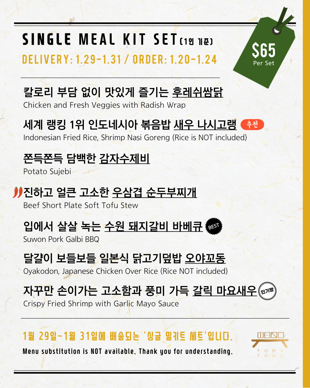 원활한 조리와 배송을 위해 메뉴 변경이 힘듭니다. 특별히 알러지가 있으신분은 따로 연락주시기 바랍니다. 이해해주셔서 감사합니다.